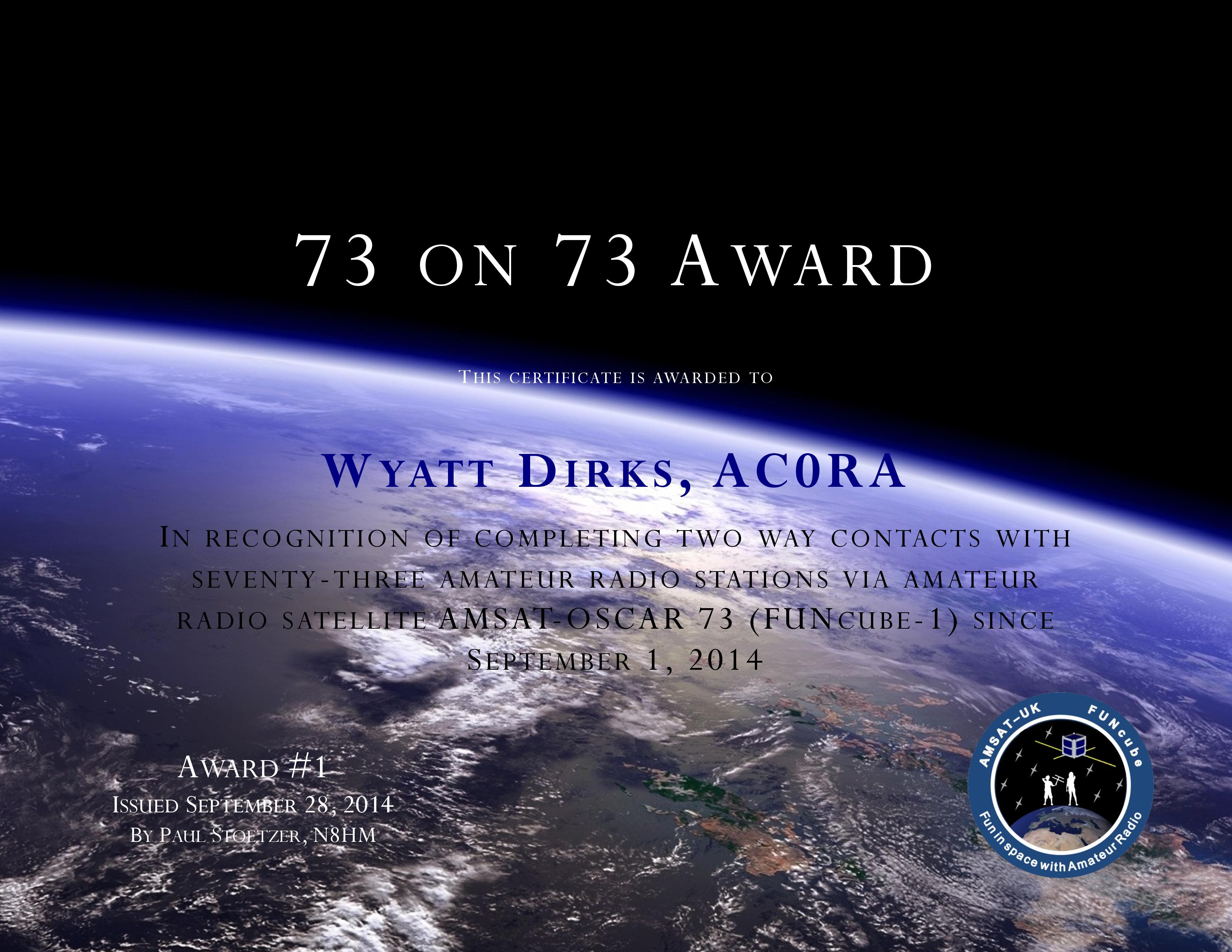 Paul Stoetzer N8HM reports the first AO-73 (FUNcube-1) 73 on 73 Award has been issued to Wyatt Dirks AC0RA.