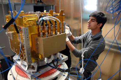 Vidur Kaushish, a student at the Naval Postgraduate School, works on the NPS CubeSat Launcher. (Courtesy NPS website)