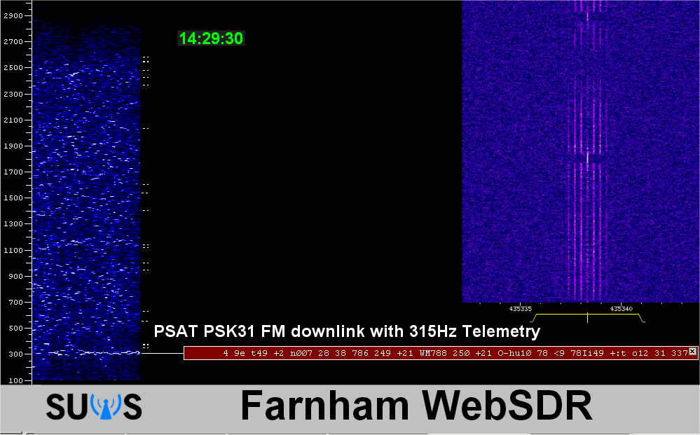 Martin Ehrenfried G8JNJ reports receiving the PSAT PSK31 FM downlink on the online SUWS WebSDR located at Farnham near London.