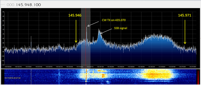 From observations, there seems to be no downlink below 145.946 MHz. By taking readings at Time of Closest Approach (TCA) on low elevation passes, which for me is about 20 minutes into the 25 minute schedule. The transponder appears as follows: